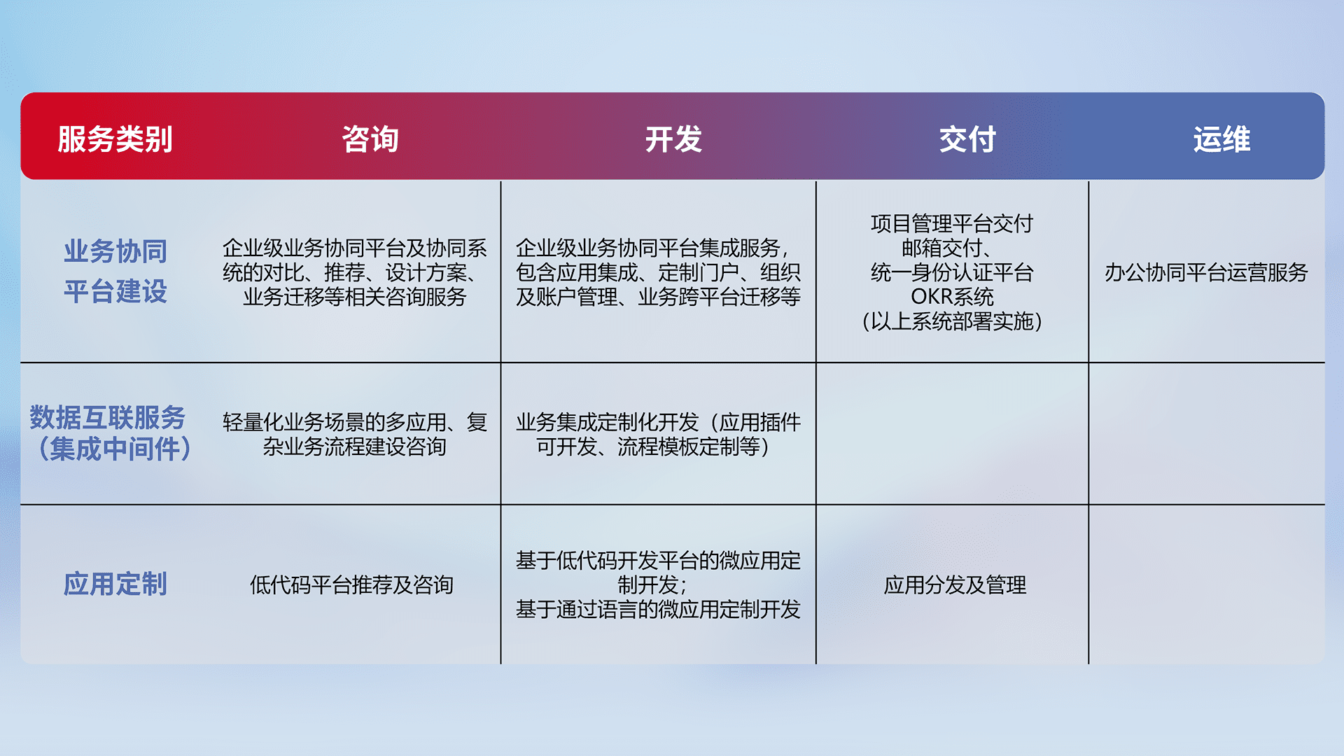 针对钉钉、、、、企微、、IDaas等平台级产品提供产品的规划、、、、方案、、、、交付、、、、定制化开发等服务,,实现如统一协同办公、、、智能客户服务、、、、混合会议管理、、、、智能数据查询、、、等业务场景,,,,实现数字化转型。。